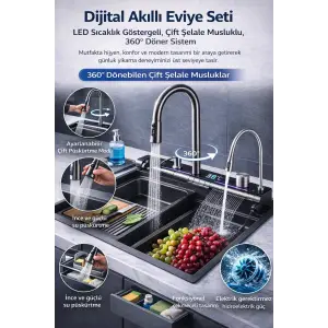 Dijital Akıllı Eviye Seti – LED Sıcaklık Göstergeli, Çift Şelale Musluklu, 360° Döner Sistem
