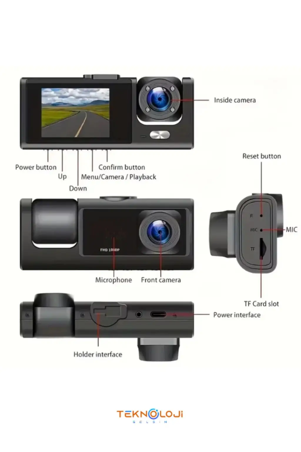 64GB Araç İçi Kamera 3 Kameralı (Yol + Araç İçi+ Arka) FHD Video Kayıt Mikrofonlu Türkçe CC-33
