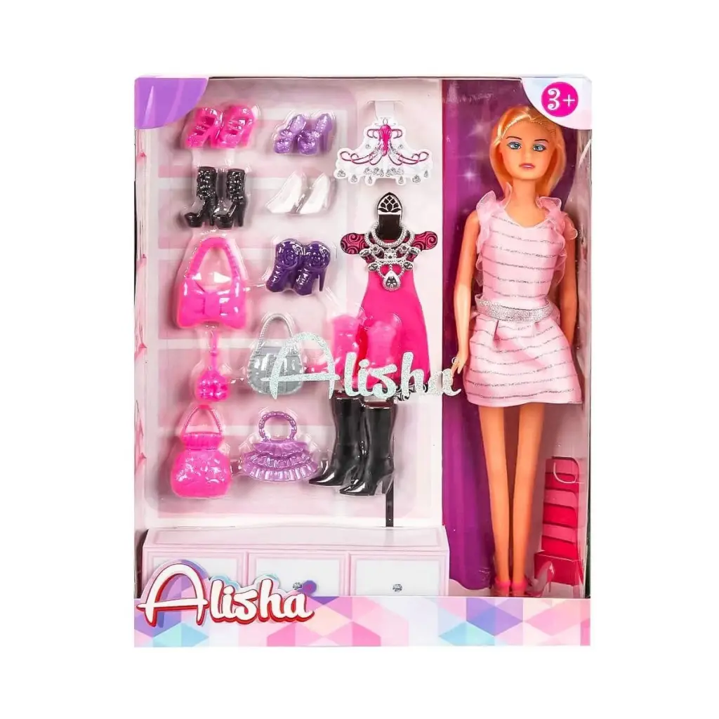 Kutu içerisinde; 1 adet Alisha bebek, 4 adet çanta, 1 adet kese, 1 adet kolye, 5 çift ayakkabı ve 2 çift botu vardır.