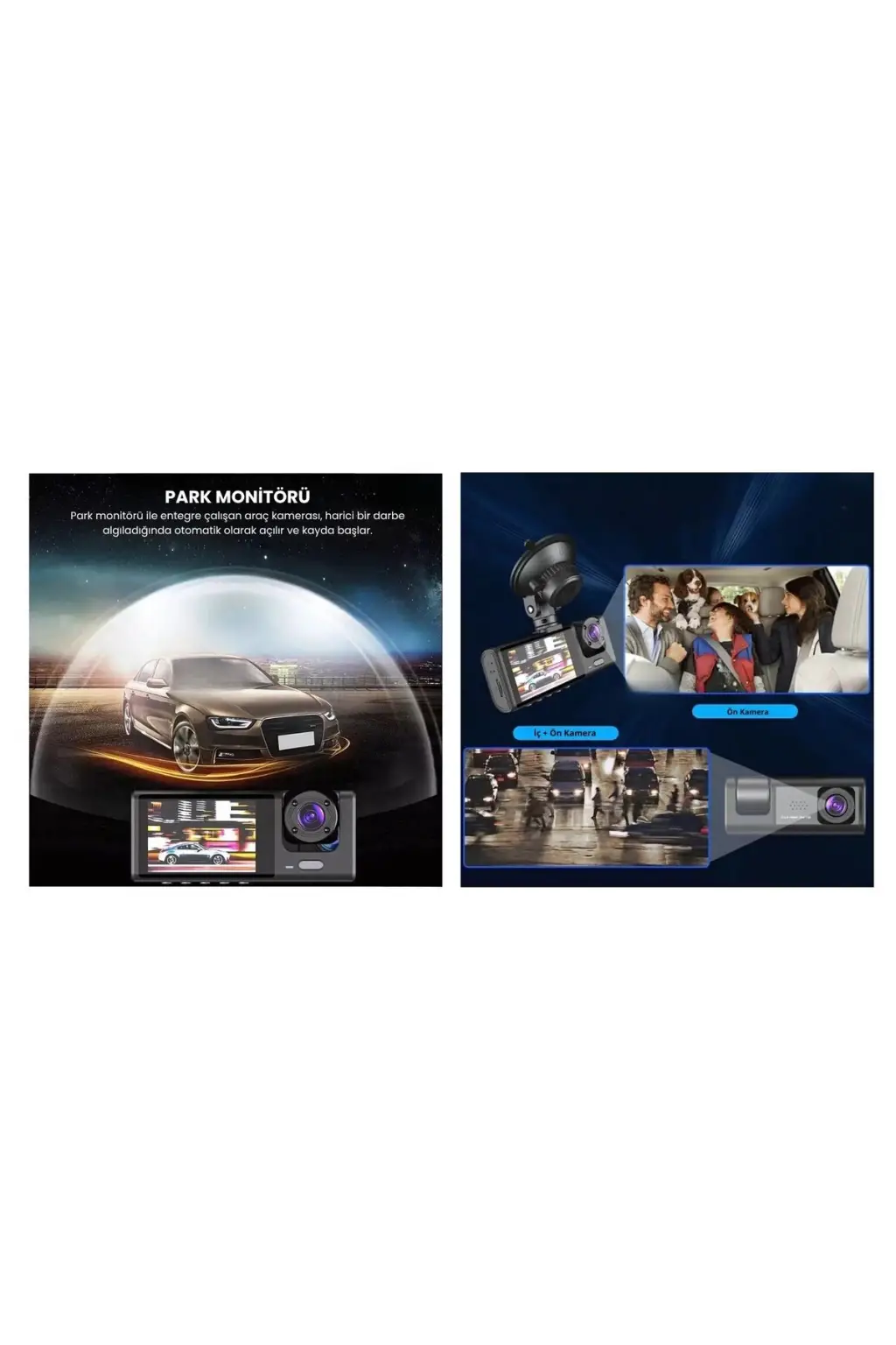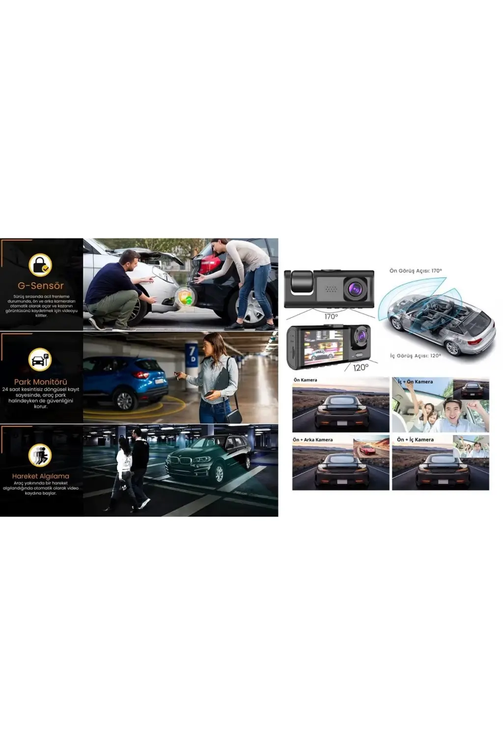 1080P Dash Cam Full Hd Araç içi Kamera Ön Arka ve İç Kayıt 3 Kamera Gece Görüşlü G Sensör Geniş Açı