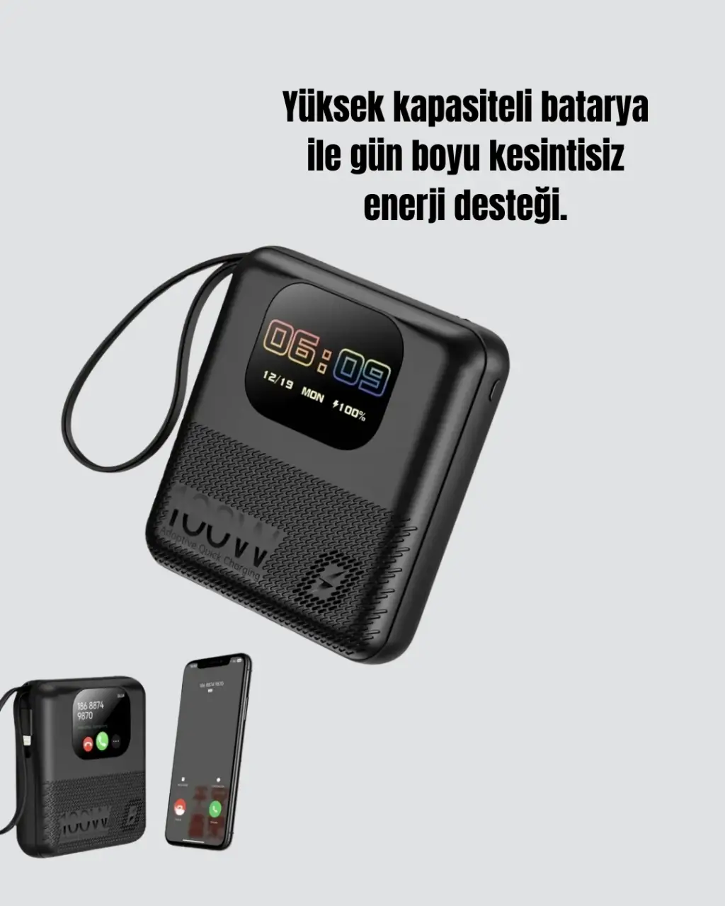 Günlük yaşamın temposuna ayak uydurmak artık çok daha kolay! 10.000 mAh’lık yüksek kapasiteli bataryaya sahip bu akıllı cihaz, hem telefonunuzu hem de diğer mobil cihazlarınızı defalarca şarj etme imkanı sunar. Üstelik yalnızca bir powerbank değil, aynı zamanda tam donanımlı bir akıllı saat özelliklerine sahiptir. Adım sayar, kalp atış hızınızı ölçer, uyku takibinizi yapar ve günlük aktivitelerinizi detaylı şekilde analiz eder. Gelen çağrılar, mesajlar ve bildirimler bileğinizde görüntülenir, böylece telefonunuza uzanmadan her şeyden haberdar olabilirsiniz. USB çıkışı sayesinde farklı marka ve modellerle uyumludur. Su geçirmez tasarımı, hem spor yaparken hem de seyahatlerinizde güvenle kullanım sağlar. Bluetooth ve Wi-Fi desteği ile kolay eşleştirme imkanı sunar. Şık tasarımı, hafif ve ergonomik yapısı ile gün boyu bileğinizde konforla taşınabilir. Bu cihaz, teknoloji ve konforu tek bir üründe isteyen herkes için mükemmel bir çözümdür.