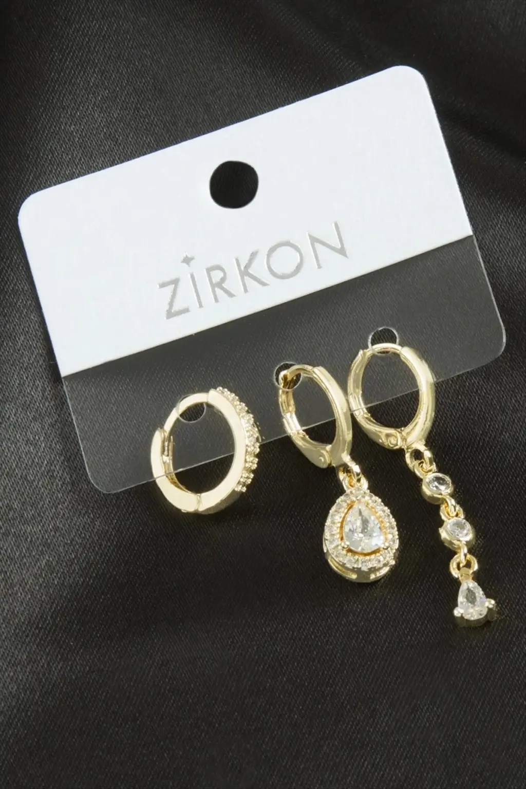 Küpe; Ürün malzemesi metal ve zirkon taşından imal edilmiştir. 1 sınıf malzeme kullanılmıştır. Ürün boyu yaklaşık 4,5 cmdir. 1 kartta 3 adet küpe bulunmaktadır.