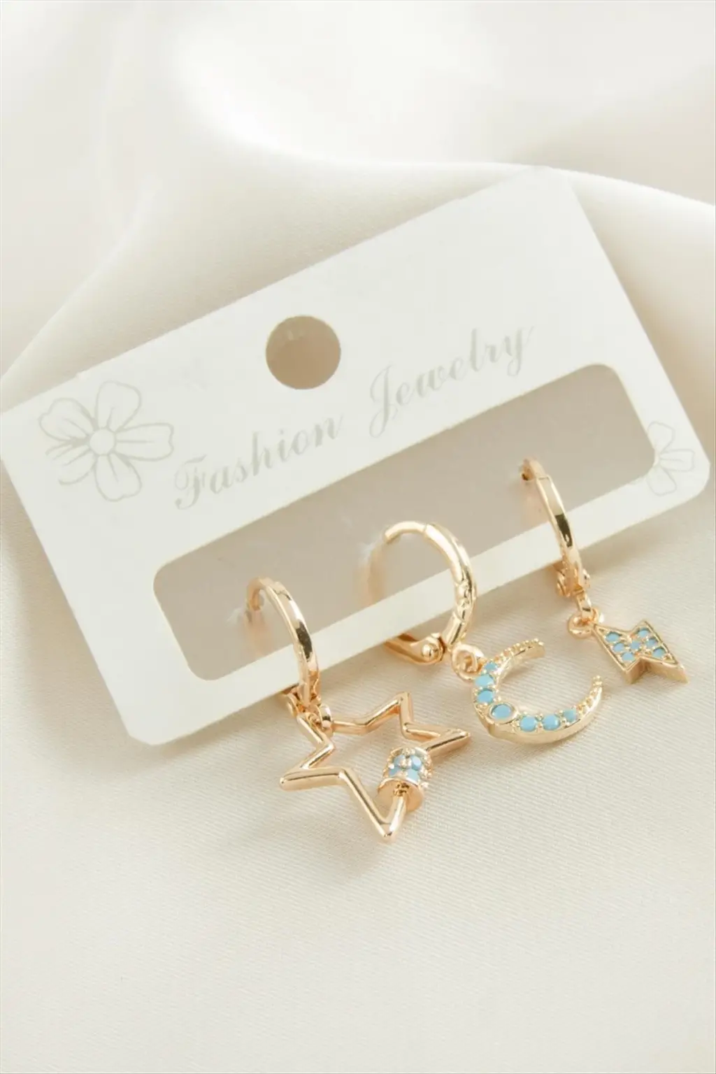 3 Adet Hilal Yıldız Zirkon Taşlı Küpe