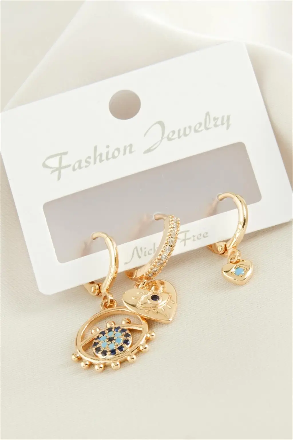 3 Adet Kalp Nazar Zirkon Taşlı Küpe