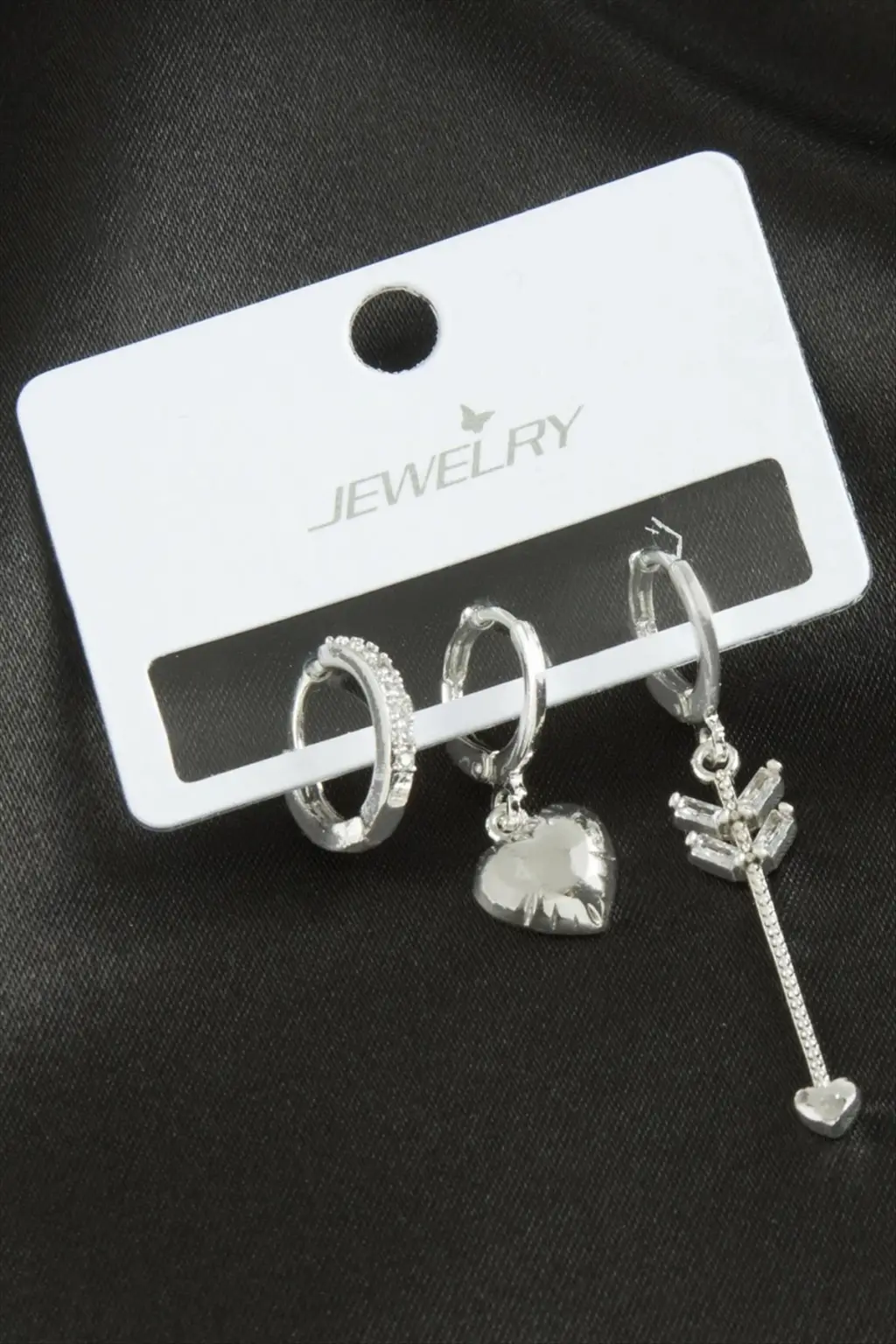 Küpe; Ürün malzemesi metal ve zirkon taşından imal edilmiştir. 1 sınıf malzeme kullanılmıştır. Ürün boyu yaklaşık 4 cmdir. 1 kartta 3 adet küpe bulunmaktadır.