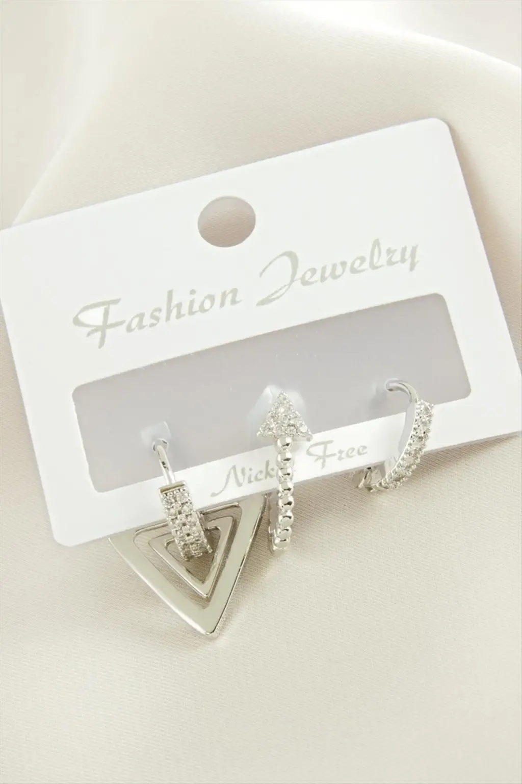 Küpe; Ürün malzemesi metal ve zirkon taşından imal edilmiştir. 1 sınıf kaliteli malzeme kullanılmıştır. Ürün boyu 2,5 cmdir. 1 kartta 3 adet küpe bulunmaktadır.