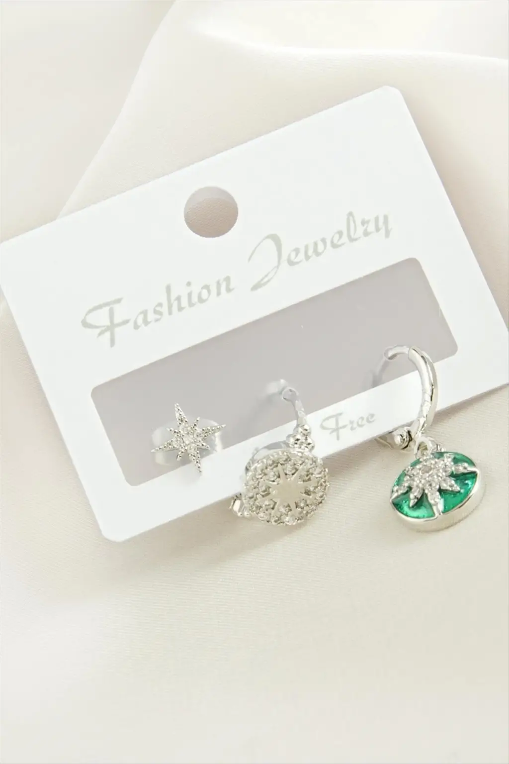 Küpe; Ürün malzemesi metal ve zirkon taşından imal edilmiştir. 1 sınıf kaliteli malzeme kullanılmıştır. Ürün boyu yaklaşık 3 cmdir. 1 kartta 3 adet küpe bulunmaktadır.