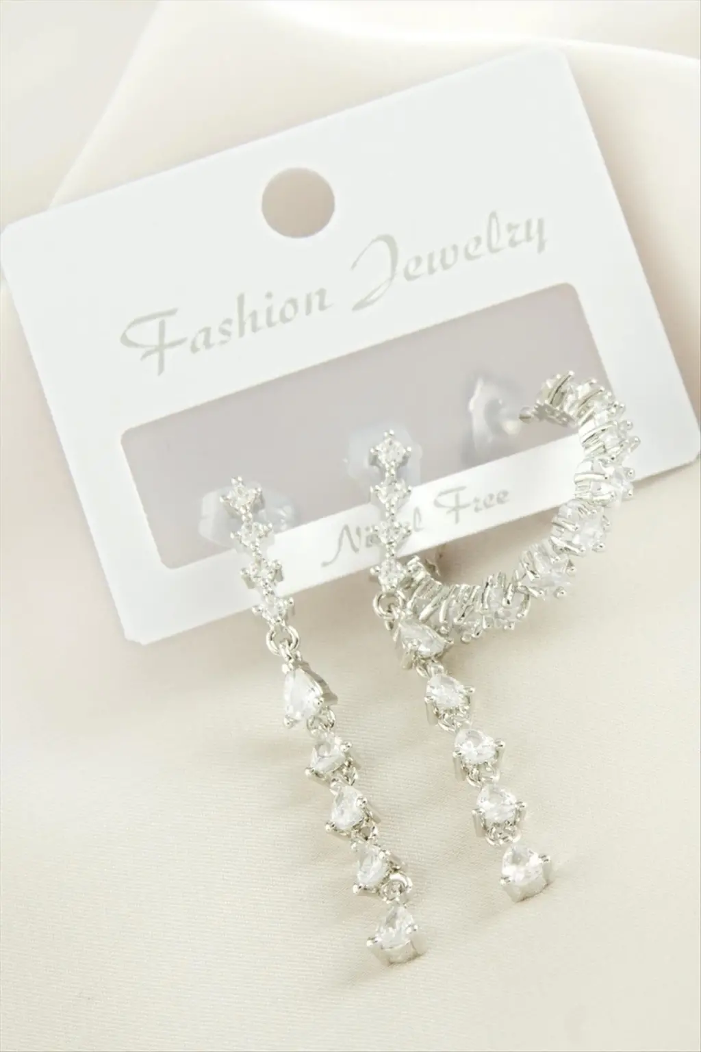 Küpe; Ürün malzemesi metal ve zirkon taşından imal edilmiştir. 1 sınıf kaliteli malzeme kullanılmıştır. Ürün boyu 4 cmdir. 1 kartta 3 adet küpe bulunmaktadır.