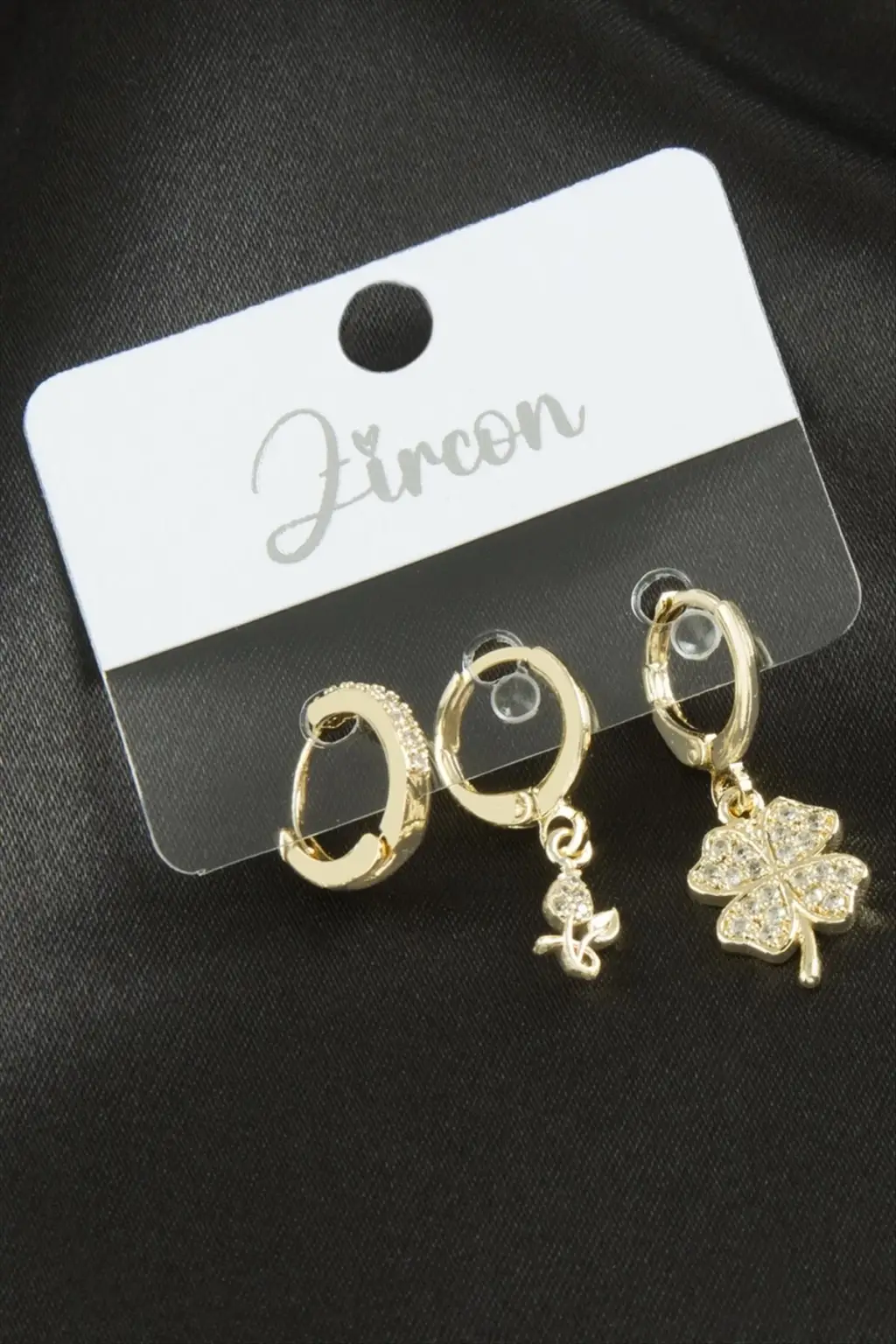 Küpe; Ürün malzemesi metal ve zirkon taşından imal edilmiştir. 1 sınıf malzeme kullanılmıştır. Ürün boyu yaklaşık 2,5 cmdir. 1 kartta 3 adet küpe bulunmaktadır.