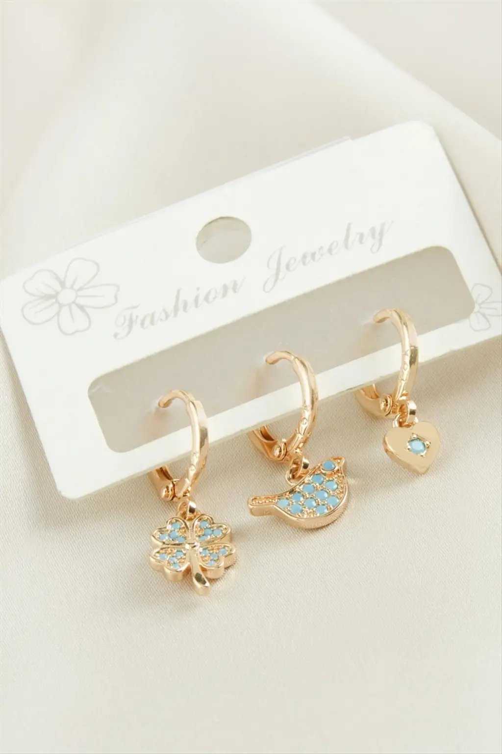 Küpe; Ürün malzemesi metal ve zirkon taşından imal edilmiştir. 1 sınıf kaliteli malzeme kullanılmıştır. Ürün boyu 2,5 cmdir. 1 kartta 3 adet küpe bulunmaktadır.