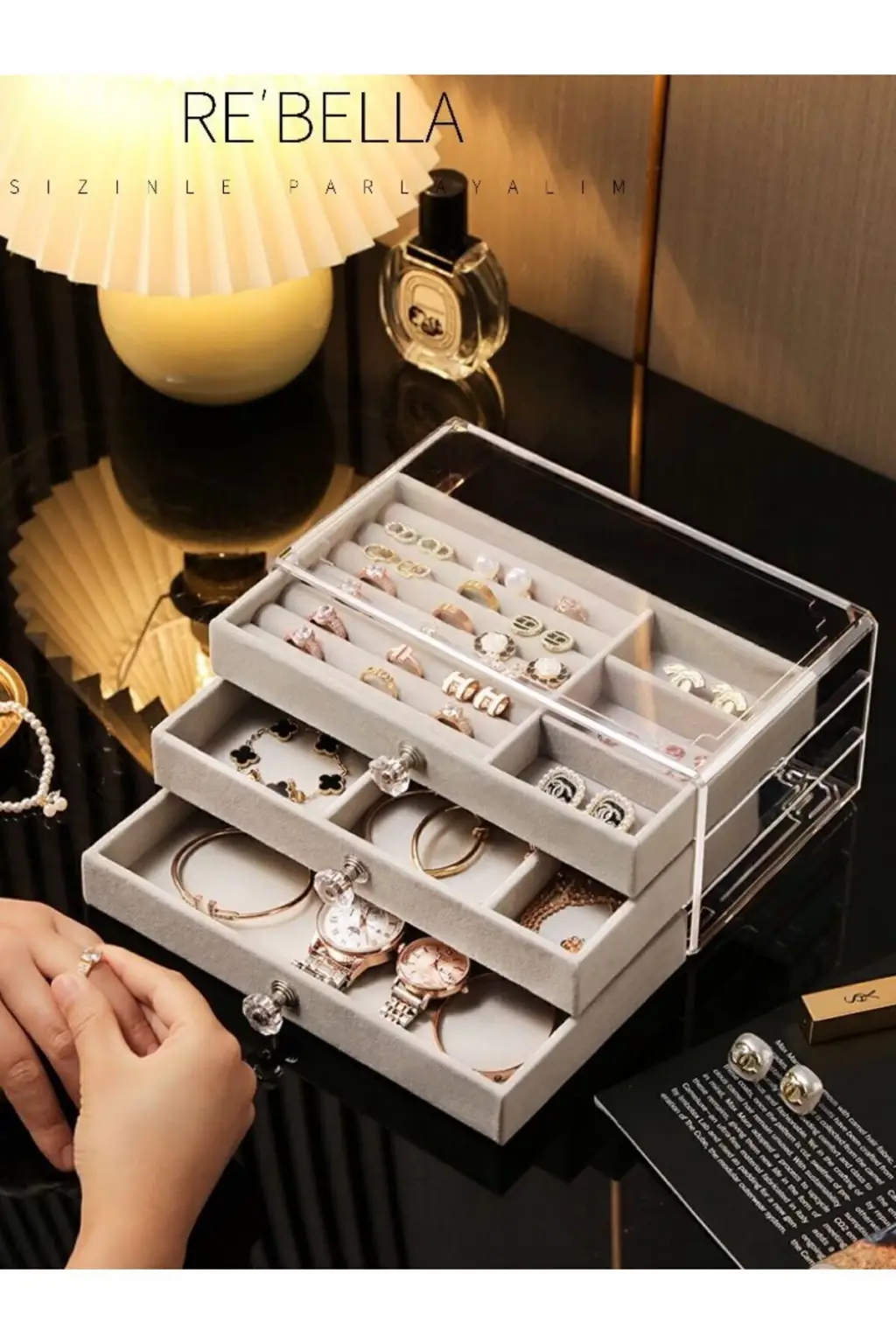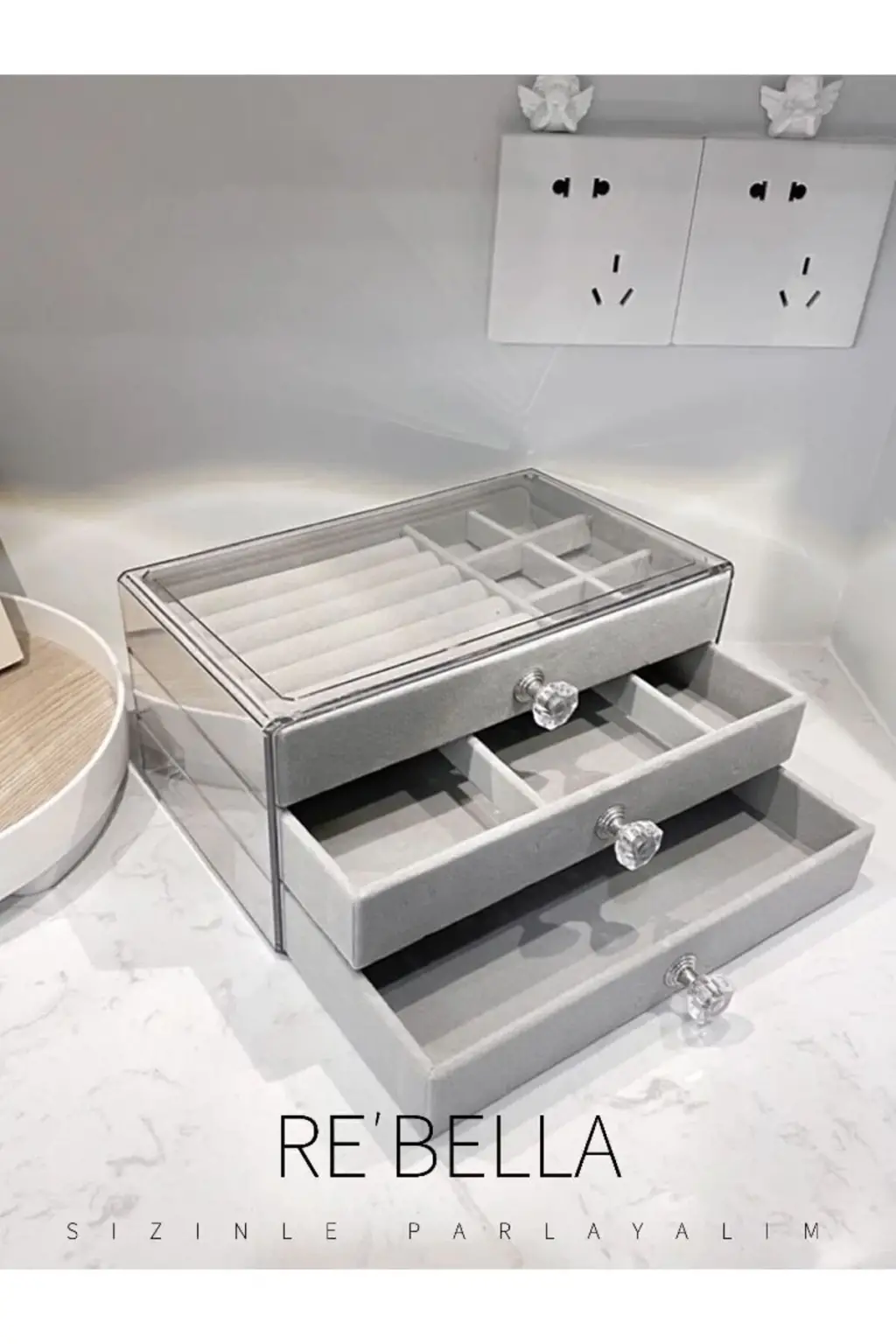 3 Çekmeceli Bölmeli Şeffaf Kadife Mücevher Takı Kutusu Küpe Yüzük Kolye Düzenleyici Organizer
