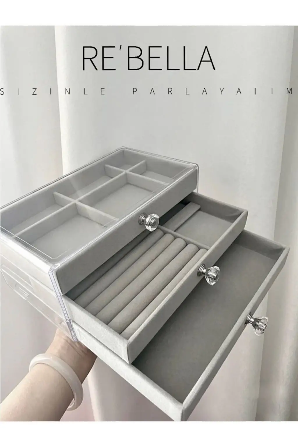 3 Çekmeceli Bölmeli Şeffaf Takı Kutusu | Mücevher Saklama Kutusu | Gri Renk Seçeneği 13x23x10