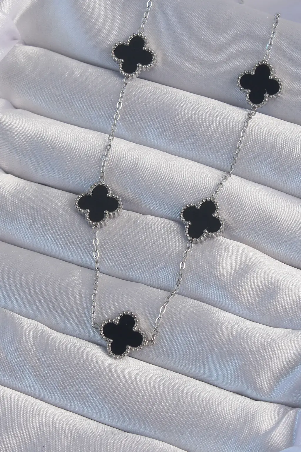 316l Çelik Gümüş Renk Siyah Mineli Yonca Kolye