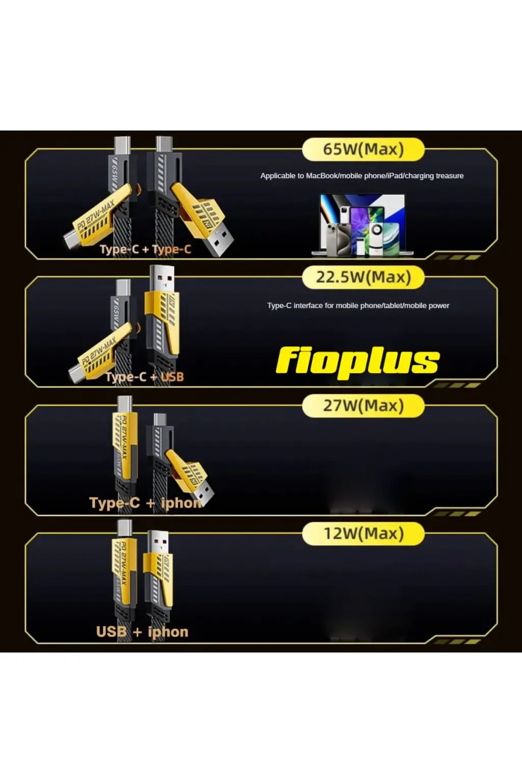 4in1 PD 65 Watt Type-C/27 Watt iPhone Halat Örgü Kırılmaz Uç 1MT Hızlı Şarj ve Data Kablosu fp98 ile elektronik cihazlarınızı güvenle şarj edebilir ve veri transferi yapabilirsiniz.