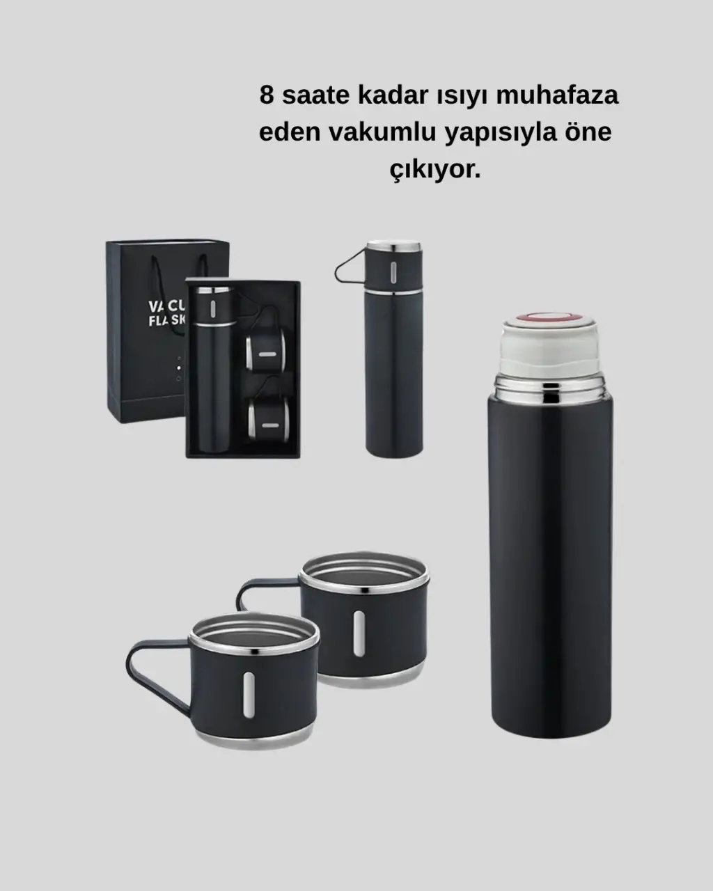 Gün boyu içeceklerinizi ideal sıcaklıkta tutmanın en pratik yolu: 500 ml Paslanmaz Çelik Termos Seti!Hem sıcak hem de soğuk içecekler için mükemmel yalıtım sunan bu termos, her mevsimde yanınızda taşıyabileceğiniz şık ve işlevsel bir yardımcıdır.Yüksek kaliteli paslanmaz çelik malzeme, ısıyı 8 saate kadar koruyan çift katmanlı vakum teknolojisiyle birleşir. Bu sayede sabah hazırladığınız kahvenizi akşam bile sıcak, soğuk içeceklerinizi ise uzun süre serin tutabilirsiniz. Termosun sızdırmaz basınçlı kapağı, çantanızda ya da aracınızda gönül rahatlığıyla taşımanızı sağlar — dökülme veya akma derdi olmadan!Ergonomik ve hafif tasarımı sayesinde günlük kullanım için idealdir. İster ofiste, ister okulda, ister sporda olun; taşınabilir formu sayesinde yanınızdan ayırmak istemeyeceğiniz bir üründür. Elde kolayca kavranabilir yapısı, kullanım konforunu artırır.500 ml kapasitesi, gün boyu yetecek miktarda kahve, çay veya soğuk içecek taşımanıza imkan verir. Temizliği ise son derece pratiktir — sadece ılık su ve yumuşak deterjanla elde yıkayarak hijyenik kullanım sağlayabilirsiniz.Modern tasarımı, dayanıklı malzemesi ve uzun süreli ısı muhafaza özelliğiyle bu termos seti, hem kendi kullanımınız hem de sevdikleriniz için mükemmel bir hediye seçeneğidir.Evde, ofiste, sporda veya seyahatte; her yudumda tazelik, her kullanımda konfor!