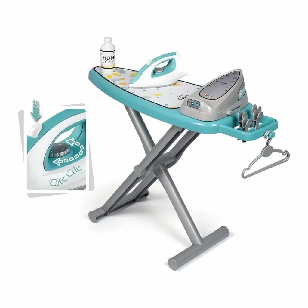 Ütü masası'nın gerçekçi, sabit plastik çerçevesi ve ütüyü saklamak için bir buharlı ütü istasyonu vardır.