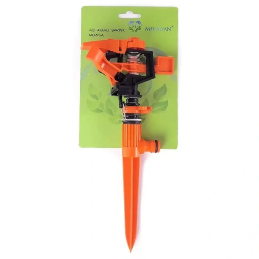 AÇI AYARLI SAPLAMALI SPRİNK FISKİYEÜrün ÖzellikleriAçı ayarlı saplamalı sprink fıskiye, sulama yönünü kontrol etmek isteyen kullanıcılar için özel olarak tasarlanmıştır. Ayarlanabilir başlık mekanizması sayesinde suyun püskürtme açısı istenilen şekilde ayarlanabilir ve belirli alanların hedefli şekilde sulanması sağlanır. 360 derece dönebilme özelliğiyle birlikte geniş çaplı sulama yapabilir. Sivri saplama atı, toprağa kolayca yerleştirilerek sabitlenir ve kullanım sırasında kayma yapmaz. Dayanıklı plastik malzemeden üretilmiş olup, uzun ömürlü dış mekân kullanımı için uygundur. Bahçe, tarla, sera veya çim alanlarda verimli ve kontrollü sulama sağlar. 1/2" hortum bağlantısına uyumludur ve kolay kurulum imkanı sunar.Paket İçeriği1 Adet Açı Ayarlı Saplamalı Sprink Fıskiye