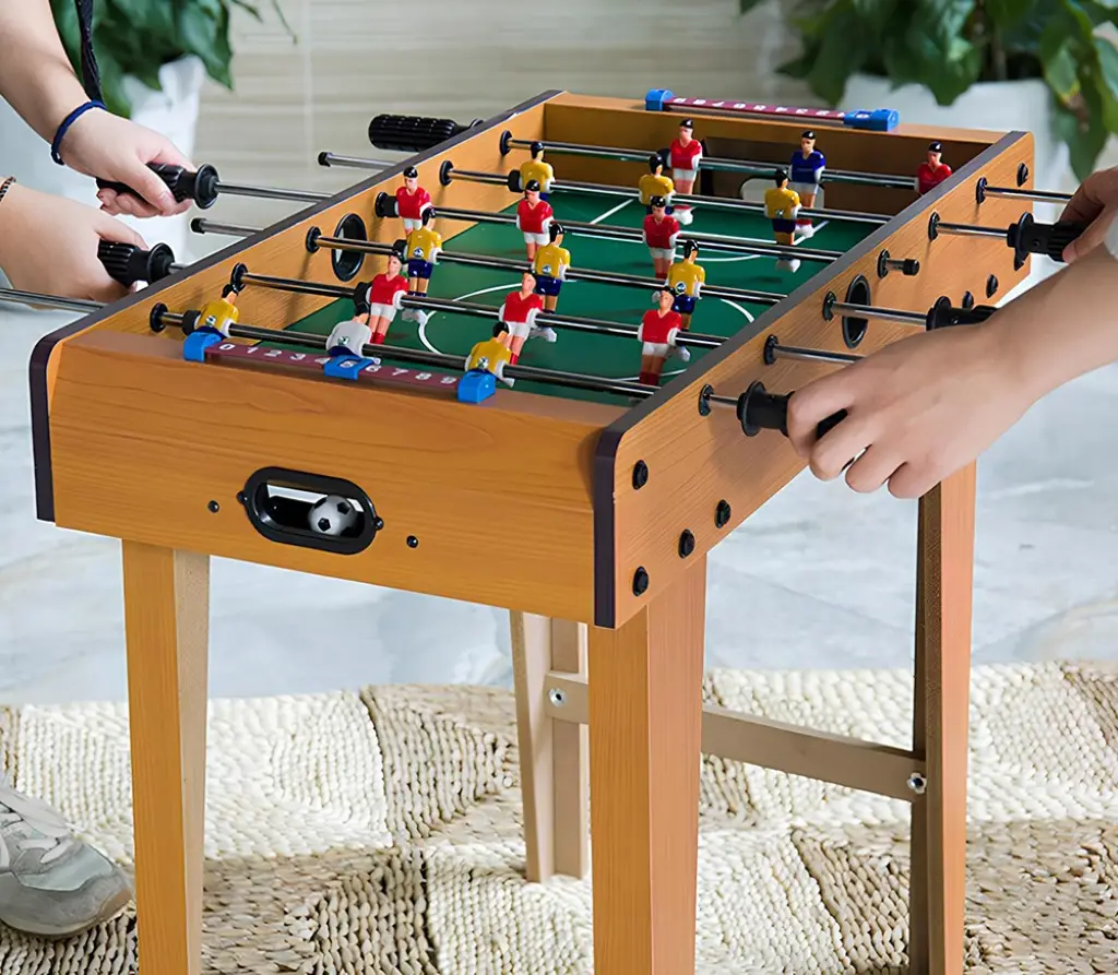 AHŞAP AYAKLI LANGIRT OYUNUÜrün ÖzellikleriAhşap Ayaklı Langırt Oyunu, klasik langırt keyfini daha konforlu ve gerçekçi bir deneyimle sunan, ayaklı tasarımı sayesinde masa gerektirmeden kullanılabilen eğlenceli bir oyun setidir. 70x60 cm ölçüsü ile hem çocuklar hem de yetişkinler için ideal bir oyun alanı sunar. Sağlam ahşap gövdesi ve dengeli ayak yapısı sayesinde oyun sırasında sarsılma yapmaz ve uzun süreli kullanımlarda formunu korur. Metal çubuklar üzerinde yer alan oyuncu figürleri akıcı hareket kabiliyeti sağlayarak hızlı ve kontrollü oyun imkânı sunar. Ergonomik tutma kolları sayesinde rahat kavrama sağlanırken, ev ortamlarında, oyun odalarında, kafe ve sosyal alanlarda keyifle kullanılabilecek bir üründür. Kurulumu kolay olan yapısı sayesinde kısa sürede kullanıma hazır hale gelir ve arkadaş gruplarıyla rekabet dolu maçlar yapmak için idealdir.Paket İçeriği1 adet Ahşap Ayaklı Langırt Oyunu