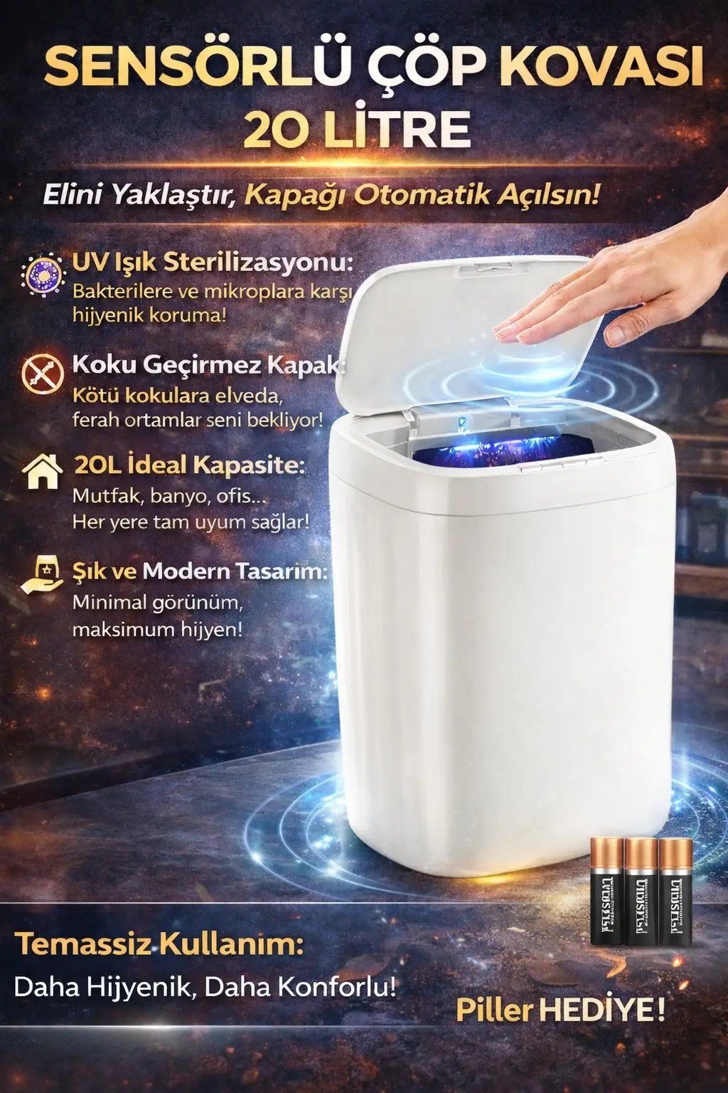 Akıllı Sensörlü UV Işıklı 20 Litre Çöp Kovası - Mutfak, Banyo, İşyeri ve Ofis Kullanımı kaliteli bir şekilde sunuluyor.