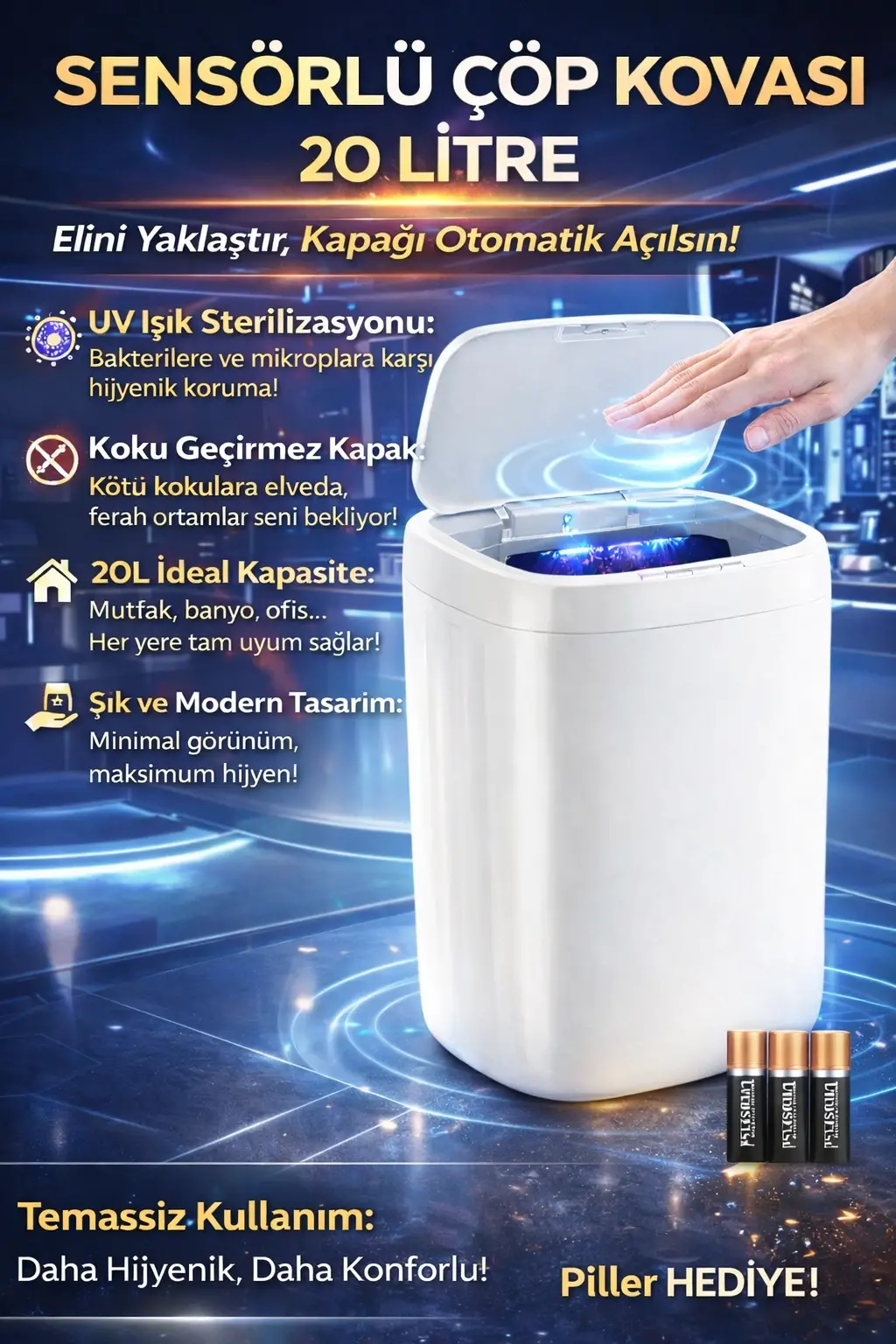 Sensörlü Teknolojik Çöp Kovası ile yaşam alanlarınızı düzenli tutarken teknolojinin konforunu yaşayın