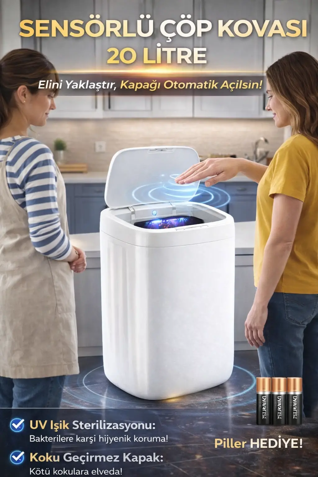 tasarlanan akıllı teknolojik sensörlü otomatik açılan kapaklı 20 litre çöp kovası, evinizdeki hijyen ve konforu maksimum seviyeye çıkaracak! UV ışıklı özelliği sayesinde bakteri ve kötü kokuları etkili bir şekilde engeller, çevreye hoş bir koku yayarak ferah bir ortam yaratır.