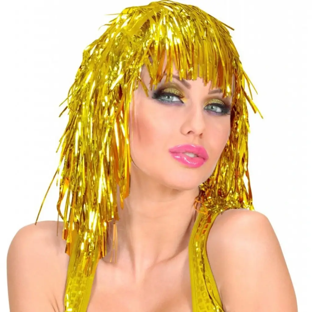Gösterişli ve ışıltılı görünümün simgesi metalize altın peruk, her ortamda sizi ön plana çıkarır. Işıkla parlayan altın tonları sayesinde özel davetler, yılbaşı ve karnaval etkinliklerinde göz kamaştırıcı bir etki yaratır.
