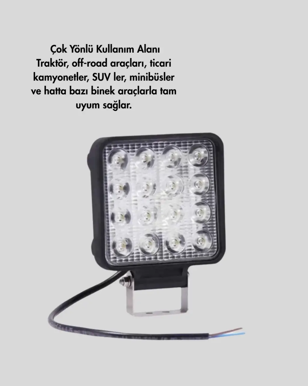Sadece araçlar değil, aynı zamanda açık alan çalışma sahaları, garajlar ve kamp alanları için de kullanılabilen bu 16 LED'li far, çok yönlü bir aydınlatma çözümüdür. Kompakt boyutlarına rağmen yüksek ışık gücü sunar ve geniş alanı aydınlatmakta başarılıdır.Dayanıklı dış kasası darbe, toz ve neme karşı koruma sağlarken; geniş açılı LED’leri sayesinde karanlık ortamları güçlü şekilde aydınlatır. Gece inşaat çalışmaları, çiftlik alanları ve acil durum aydınlatmaları için idealdir. Pratik montajıyla hızlı kurulum sağlar.