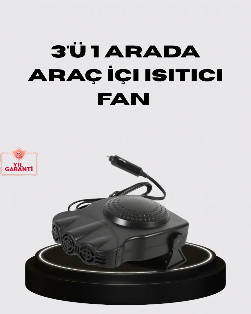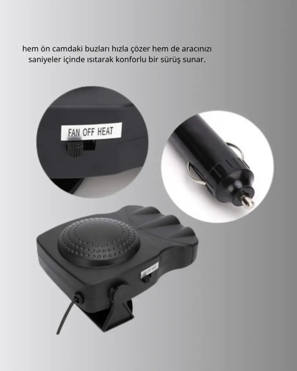 Her mevsime uygun pratik bir çözüm arıyorsanız, Araç İçi Isıtıcı ve Fan 3’ü 1 Arada 12V Çakmak Girişli ve Hızlı Isınma Özellikli tam size göre!Bu cihaz, ısıtma, soğutma ve buz çözme fonksiyonlarını bir araya getirerek araç içi konforu maksimuma çıkarır.Kış aylarında donmuş camları birkaç saniye içinde çözer, yazın ise iç mekana serinlik getirir.150W gücündeki motoru, kısa sürede etkili ısıtma ve hava sirkülasyonu sağlar.12V çakmak girişinden kolayca enerji alır; ek bağlantıya gerek kalmaz.1,2 metrelik uzun kablo, cihazı ön konsola, gösterge paneline veya yan bölgelere yerleştirmeyi kolaylaştırır.360° dönebilen başlığı, hava akışını istediğiniz noktaya yönlendirmenizi sağlar.ABS plastik gövdesi, yüksek ısıya dayanıklıdır ve uzun ömürlü kullanım sunar.Kompakt tasarımı sayesinde aracınızda yer kaplamaz, her yolculukta size eşlik eder.Araç İçi Isıtıcı ve Fan 3’ü 1 Arada 12V Çakmak Girişli ve Hızlı Isınma Özellikli, soğuk kış günlerinde güvenli sürüş sağlar, yazın ferahlatıcı bir deneyim sunar.Her sürücü için yıl boyu vazgeçilmez bir konfor çözümüdür!