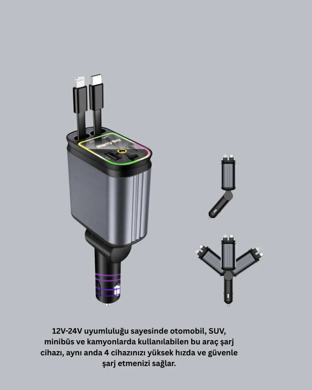Her yolculukta enerjiniz tam olsun! Araç Şarj Cihazı 4 Portlu 66W Hızlı Şarjlı LED Işıklı ve 180° Dönebilir, hem estetik hem fonksiyonel bir tasarım sunarak araç içi şarj ihtiyaçlarınıza profesyonel bir çözüm getiriyor.66W güç kapasitesi, aynı anda dört cihazı hızlı bir şekilde şarj etmenize olanak tanır.PD ve QC hızlı şarj teknolojileri, akıllı telefonlar, tabletler, akıllı saatler ve kulaklıklar dahil tüm cihazlarınız için en uygun enerji akışını sağlar.80 cm çekilebilir kablosu, kablo kirliliğini ortadan kaldırırken sürüş sırasında kullanım kolaylığı sunar.180° dönebilen başlık, dilediğiniz açıdan rahat erişim sağlar ve sallantılarda gevşeme yapmadan sabit kalır.LED ışık sistemi, gece sürüşlerinde araç içi ambiyansı zenginleştirir. Müzik ritmine duyarlı ışık modları, her yolculuğu keyifli hale getirir.12V-24V uyumluluk özelliği, cihazın binek araçlardan kamyonlara kadar geniş bir yelpazede kullanılmasını sağlar.Dayanıklı malzeme yapısı uzun ömürlü kullanım sunarken, kompakt tasarımı sayesinde araç içinde yer kaplamaz.Araç Şarj Cihazı 4 Portlu 66W Hızlı Şarjlı LED Işıklı ve 180° Dönebilir, teknolojiyi şıklıkla birleştirerek her yolculuğu konforlu hale getirir.