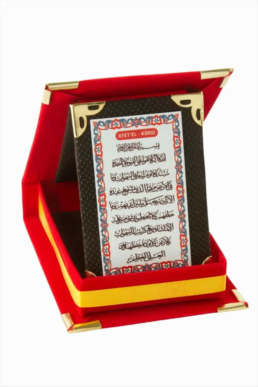 Süet kutulu plaket, metal üzerine yazı yazılarak üretilmiştir, ölçüleri kurulu vaziyette; yükseklik: 11cm, genişlik: 8 cm'dir.