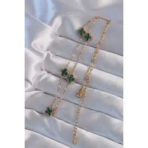 316L Çelik Gold Renk Minimal Yeşil Mineli Yonca Kolye
