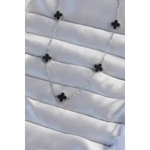316L Çelik Gümüş Renk Minimal Siyah Mineli Yonca Kolye