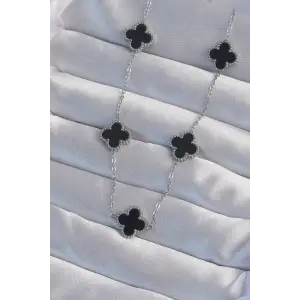 316L Çelik Gümüş Renk Siyah Mineli Yonca Kolye