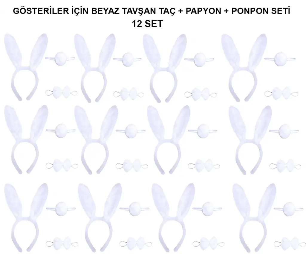 Beyaz Tavşan Kostüm Seti – 12’li Paket (Taç + Papyon + Ponpon)