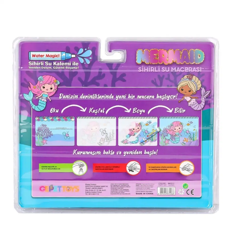Sihirli Su Macerası Kapağı açın ve suyla doldurun. Boyayın. 10 Dakika sonra sihir kayboluyor.