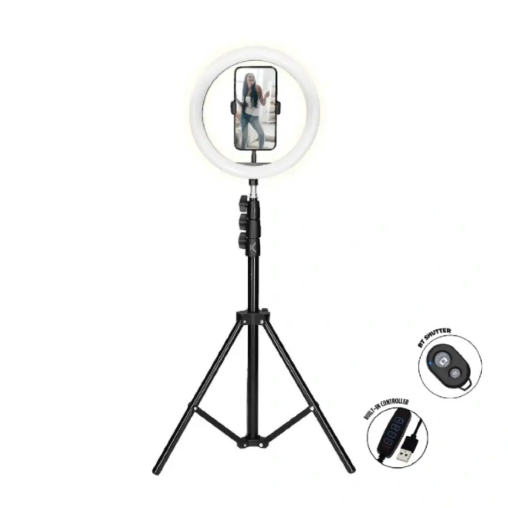 BLUETOOTH KUMANDALI SELFIE IŞIĞIÜrün ÖzellikleriBluetooth Kumandalı Selfie Işığı, profesyonel aydınlatma ihtiyacı olan içerik üreticileri, makyaj sanatçıları, canlı yayın yapanlar ve fotoğraf-video çekimlerinde kusursuz ışık arayan herkes için ideal bir çözümdür. 10 inç genişliğindeki güçlü LED halka ışık, üç farklı renk sıcaklığı seçeneği (5500K – 4350K – 3200K) sayesinde her ortama uyum sağlar. 1000 lümen ışık akışı sunan LED yapısı ile yüz hatlarını dengeler, gölgeleri azaltır ve net, doğal bir görüntü elde edilmesine yardımcı olur.210 cm’ye kadar uzayabilen tripod standı, çekim sırasında esnek kullanım imkânı sunar. USB bağlantısı sayesinde powerbank, bilgisayar veya adaptör üzerinden kolayca çalıştırılabilir. Bluetooth kumandası, uzaktan fotoğraf çekme ve video başlatma işlemlerini çok daha pratik hale getirir. 1,9 metre kablo uzunluğu ve hafif ABS malzemesiyle taşınabilir, dayanıklı ve kullanımı rahat bir aydınlatma ekipmanıdır. Telefon tutucu aparatı sayesinde dikey veya yatay çekimler yapabilir, profesyonel bir görünüm elde edebilirsiniz.Paket İçeriği1 adet Bluetooth Kumandalı Selfie Işığı