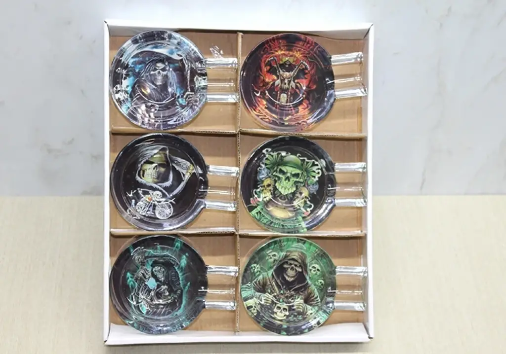 CAM PURO KÜLLÜK MODEL 4Ürün ÖzellikleriCam Puro Küllük Model 4, yuvarlak şekli ve hayalet iskelet temalı tasarımıyla dikkat çeker. Yüksek kaliteli cam malzemeden üretilmiş olan bu küllük, dayanıklı yapısı ile uzun süre kullanım sağlar. Hayalet iskelet motifleriyle süslenmiş, dekoratif ve şık bir tasarıma sahiptir. Hem estetik hem de fonksiyonel olan bu obje, puro severler için vazgeçilmez bir aksesuar olarak öne çıkar.Paket İçeriği1 Adet Cam Puro Küllük Model 4