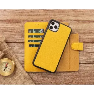 Apple iPhone 16 Pro uyumlu, Hakiki Deri, El Yapımı, Cüzdanlı Kılıf, Limon Sarı