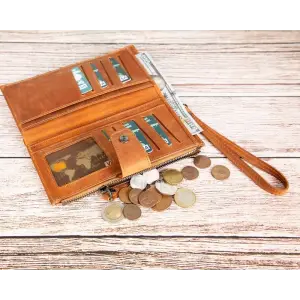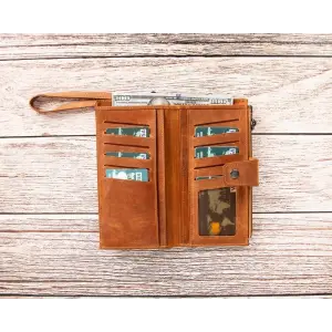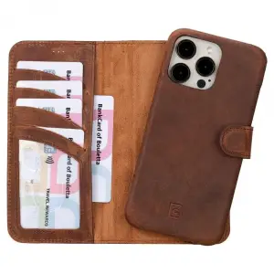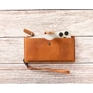 Apple iPhone 16 Pro uyumlu, Hakiki Deri, El Yapımı, Cüzdanlı Kılıf, Karamel