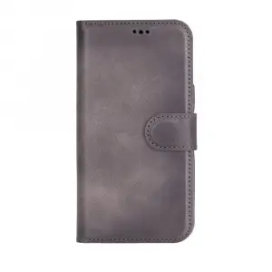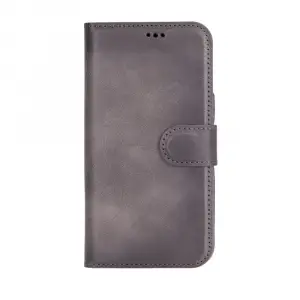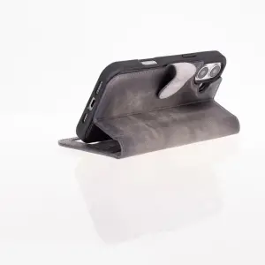 Apple iPhone 16 uyumlu, Hakiki Deri, El Yapımı, Cüzdanlı Kılıf, Gölgeli Gri