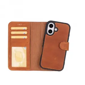 Apple iPhone 16 Plus uyumlu, Hakiki Deri, El Yapımı, Cüzdanlı Kılıf, Karamel