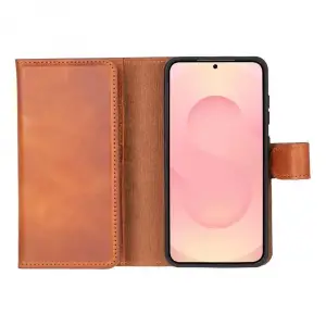 Samsung Galaxy S25 uyumlu, Hakiki Deri, El Yapımı, Cüzdanlı Kılıf, Gölgeli Kahve