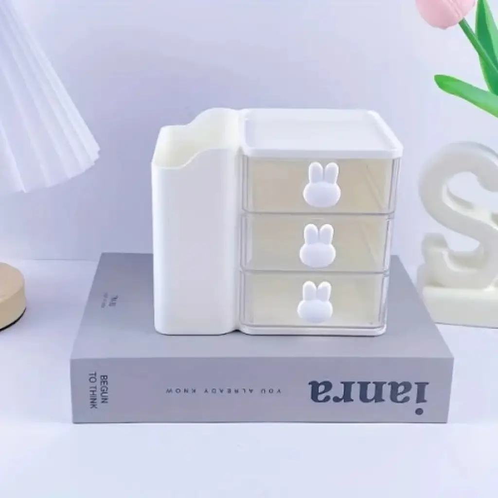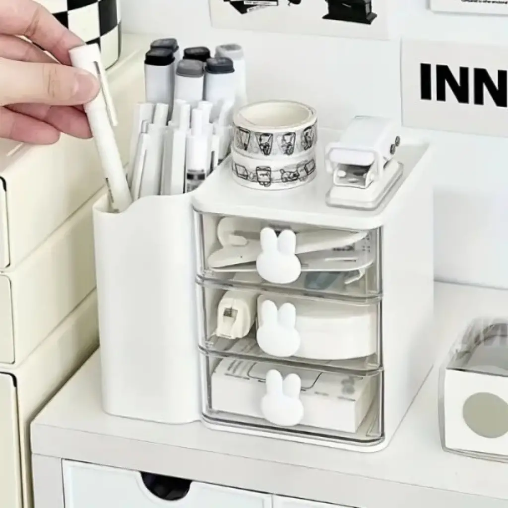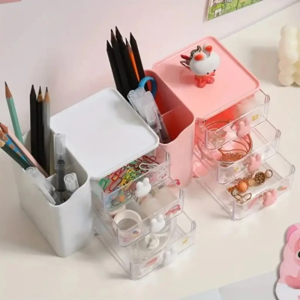ÇOK AMAÇLI ÇEKMECELİ MASAÜSTÜ ORGANIZERÜrün ÖzellikleriÇok amaçlı çekmeceli masaüstü organizer, düzenli bir masa ve pratik bir depolama çözümü sunmak için tasarlanmıştır. Şık ve minimal tasarımıyla hem makyaj malzemeleri, hem takılar hem de kırtasiye ürünlerini düzenli bir şekilde saklamanıza olanak tanır. Makyaj malzemeleri, ruj, fırça, krem kutuları gibi ürünler için ideal bir depolama çözümü olan bu organizer, kalem, bant, ataş ve diğer kırtasiye malzemelerini de düzenli bir şekilde saklamak için uygundur. Şeffaf çekmeceleri sayesinde içindeki malzemeleri kolayca görebilir ve erişebilirsiniz. Tavşan şeklindeki çekmece kulpları ürüne eğlenceli bir dokunuş katar. Yüksek kaliteli dayanıklı plastikten üretilmiş olan organizer, hafif ancak sağlam yapısıyla uzun süreli kullanım sunar. Kompakt tasarımı sayesinde masa üzerinde az yer kaplar ve dar alanlarda rahatlıkla kullanılabilir. Evde, ofiste veya çocuk odasında rahatlıkla kullanılabilir. Masa düzeninizi sağlar ve estetik bir görünüm yaratır. Eşyalarınızı düzenli bir şekilde saklayarak kolay erişim imkanı sunar. Hem yetişkinler hem de çocuklar için kullanışlıdır.Not: Ürün 4 farklı renkte mevcuttur ve stok durumuna göre karışık gönderim yapılmaktadır.Paket İçeriği1 adet Çok Amaçlı Çekmeceli Masaüstü Organizer