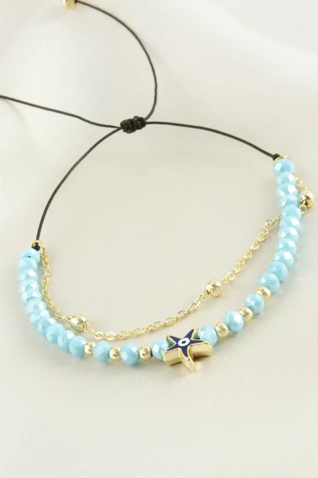 Bileklik; Ürün malzemesi metal, kristal ve makrome iptir. Arkası asansörlüdür Bileğe göre ayarlamalıdır. Kartlıdır.