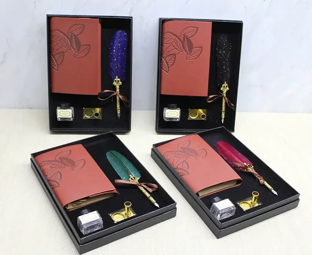 DERİ DEFTERLİ DİVİT HOKKA SETİ MODEL 2Ürün ÖzellikleriDeri Defterli Divit Hokka Seti Model 2, nostaljik yazı deneyimini estetik bir sunumla birleştiren özel bir yazı ve kaligrafi setidir. 29x21 cm ölçülerindeki hediye kutusu içerisinde yer alan deri kapaklı defter, klasik divit kalem, farklı uç seçenekleri ve hokka mürekkebi; hem pratik hem dekoratif bir kullanım sunar. Deri defter kişisel notlar, özel yazılar, günlük tutma ya da kaligrafi çalışmaları için uygun bir yüzey sağlarken divit kalem nostaljik bir yazım hissi verir. Farklı uç seçenekleri ince ve kalın yazım stillerine olanak tanır. Şık tasarımıyla koleksiyon değeri taşıyan bu set, öğretmenlere, yazı sanatına ilgi duyanlara veya özel bir hediye arayanlara hitap eden anlamlı bir seçenektir. Renk seçimi yapılamaz; görseldeki modellerden biri olarak gönderilir.Paket İçeriği1 adet Deri Defterli Divit Hokka Seti Model 2