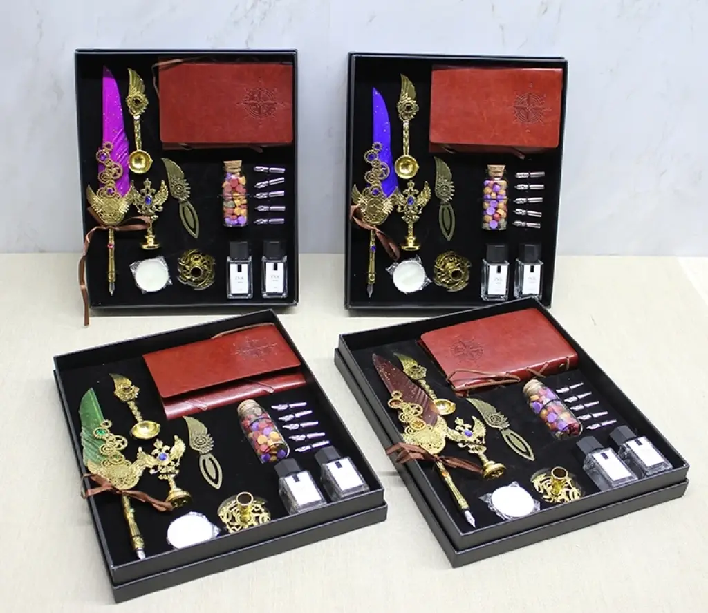 DERİ DEFTERLİ DİVİT HOKKA VE MÜHÜR SETİ MODEL 2Ürün ÖzellikleriDeri Defterli Divit Hokka ve Mühür Seti Model 2, nostaljik yazım deneyimini zengin bir içerikle birleştiren özel bir kaligrafi ve mühürleme setidir. 30x25 cm boyutundaki şık hediye kutusu içerisinde yer alan deri kapaklı defter, klasik divit kalem, farklı uç alternatifleri, hokka mürekkebi, balmumu ve mühür atı; hem estetik hem de fonksiyonel kullanım için özenle hazırlanmıştır. Deri defter, özel yazılar, günlük notlar ve hat sanatı çalışmaları için ideal bir yazım yüzeyi sunarken divit kalem ve hokka mürekkebi nostaljik bir yazı deneyimi sağlar. Mühür ve balmumu detayları ise özel mektupların, davetiyelerin ve belgelerin kişisel mühürleme ile tamamlanmasına imkân tanır. Renk seçimi yapılamaz; görseldeki seçeneklerden biri olarak gönderilir. Hem koleksiyon değeri taşıyan hem de etkileyici bir hediye niteliği sunan şık bir settir.Paket İçeriği1 adet Deri Defterli Divit Hokka Ve Mühür Seti Model 2