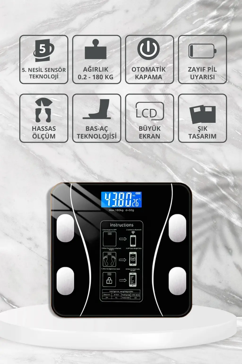 Dijital Baskül Yağ Su Kas Vücut Kitle Endeksi Kilo Ölçer Pilli Bluetoothlu