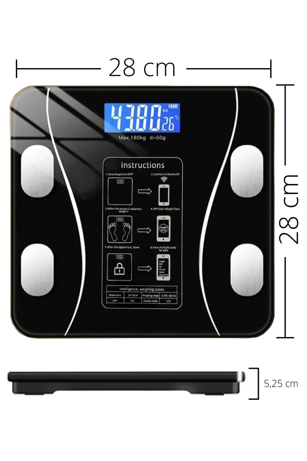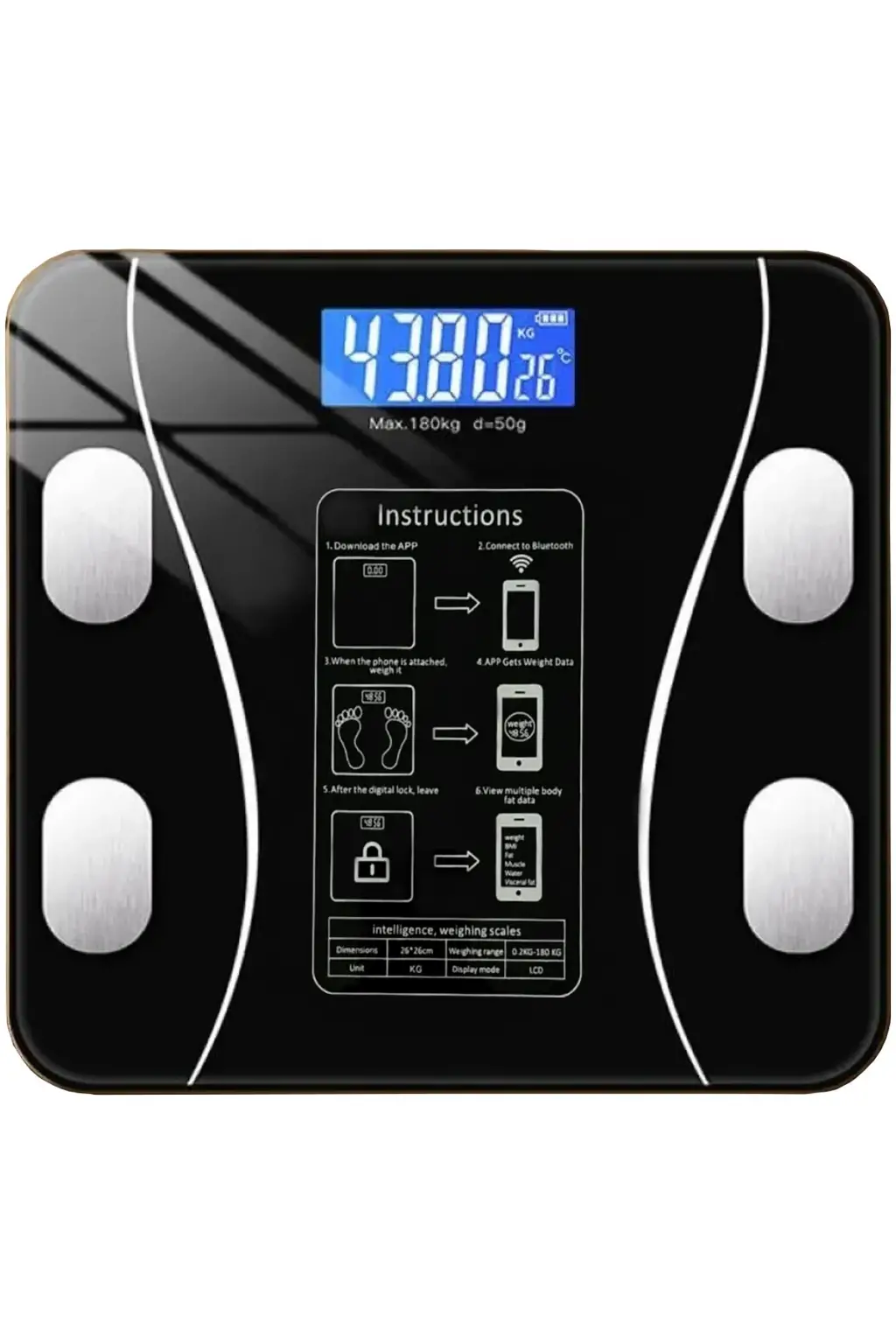 Dijital Baskül Yağ Ölçer Fonksiyonlu Akıllı Baskül Bluetooth Tartı- Siyah