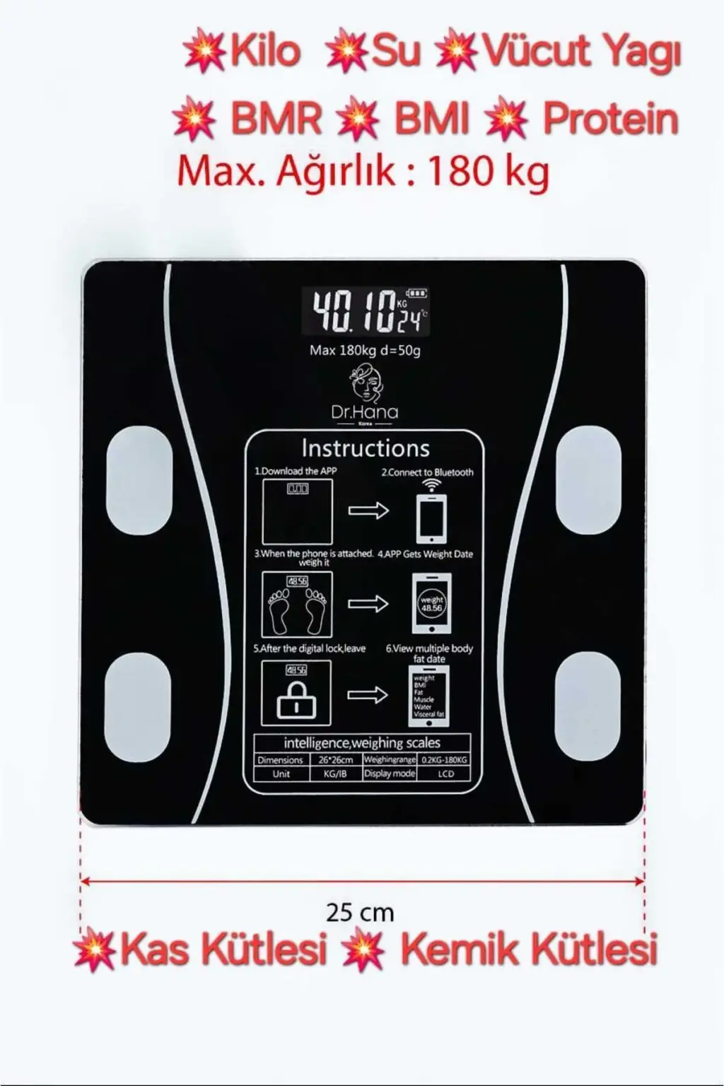 Dijital Baskül Yağ Su Kas Vücut Kitle Endeksi Kilo Ölçer Pilli Bluetoothlu
