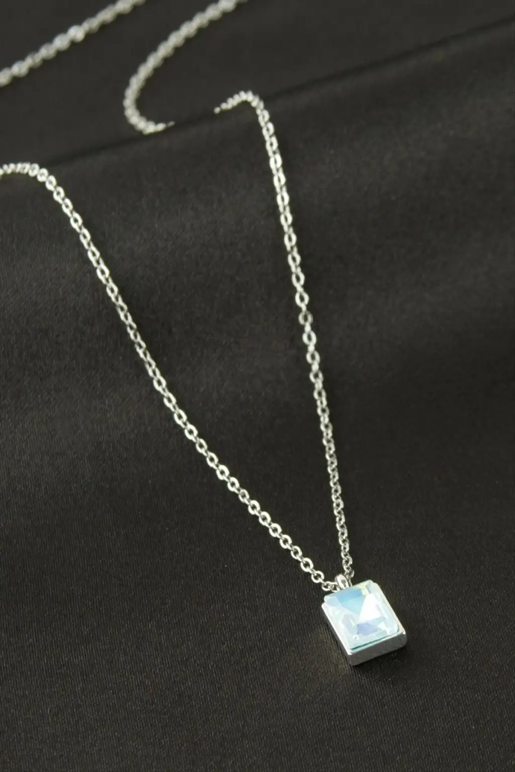 Kolye; Ürün malzemesi zincir bölümü metaldir. Zincir uzunluğu 45 cm ve ucundaki cam taş boyu 1 cmdir. Kartlıdır.